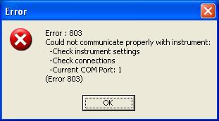 Make sure that all connections are secure. Turn off the PC, unplug the serial connection to the PC and secure it with the thumbscrews. Disconnect and reconnect the power supply. Make sure that there is power going to the instrument...that is, make sure that the outlet is active. Check for power by closing down the measurement shoe and ensure that the instrument illuminates at the point of measurement. Restart the PC and open software.